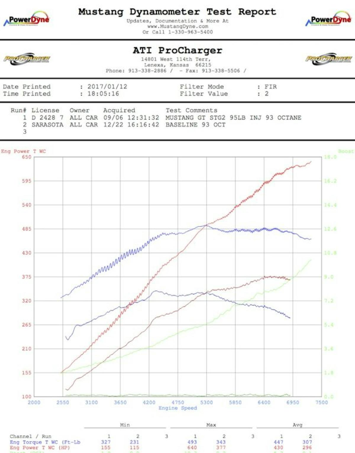 In stock form, the 2017 Mustang GT used for this testing is an automatic car with the Midwest’s finest summer 93-octane fuel in it. In stock form, this new GT baselined at 377 horsepower and 343 lb-ft of torque on ProCharger’s Mustang Dyno; and as you’ll see in the dyno graph, the ProCharger Stage 2 system delivered huge gains at the rear wheels.
