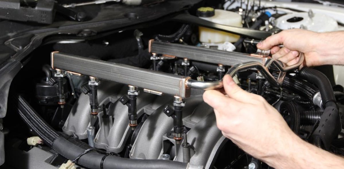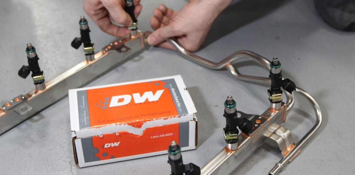 The Stage 2 kit includes a set of Deatschwerks 95 lb/hr fuel injectors. To install them you will first need to depressurize the fuel system. Then you can disconnect the fuel line from the fuel rails, remove the rail retaining bolts and remove the injector/rail assembly as one piece. Then you can slip off the injector retaining clips and pop out the stock injectors, replacing them with the larger DeatschWerks units supplied in the kit.