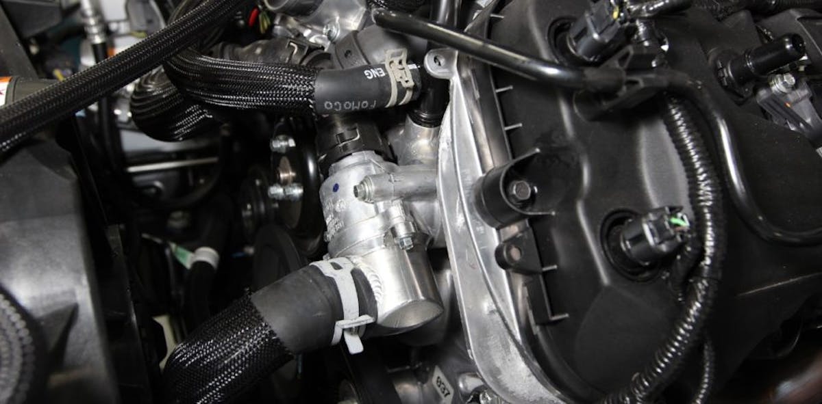 To make way for the supercharger bracket and belt drive, it’s necessary to swap out half of the factory thermostat housing with a right-angle housing that redirects the factory coolant hoses out of the way. Though it isn’t required for this kit, this would be an opportunity to install a cooler thermostat while you have the housing apart and the system drained.