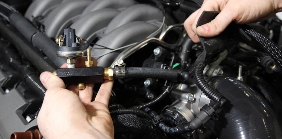 With the blower hardware in place, you can focus on the supporting hardware. ProCharger provides this vacuum adapter to allow this pressure sensor to activate the included fuel pump voltage booster. Once it is installed and wired, you can put the intake cover back on.