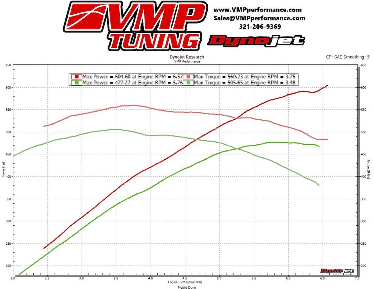 “The gains over stock are enormous,” Andrew enthused. “In my case my car made 601 horsepower and 560 lb-ft of torque at the rear wheels on the Dynojet. The car previously made 477 horsepower and 506 lb-ft of torque at the rear wheels with a 2.76 pulley, Accufab Racing throttle body, and a VMP tune. This is a very significant gain, and it’s definitely something you can feel. One of the most notable differences is the fact that the TVS does not get nearly as hot as the factory Eaton unit.”