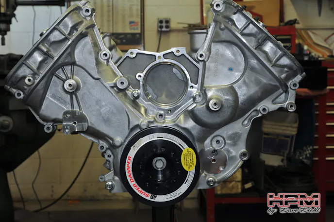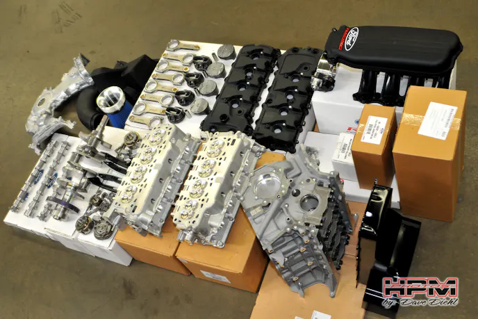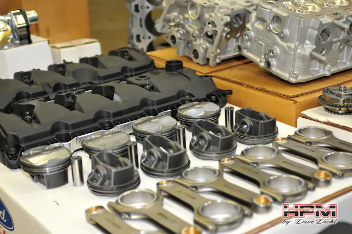 Tuning: SCT Performance customBottom end components consist of a cross-plane forged steel crankshaft with a 93mm stroke from Ford Performance (PN M-6303-M52), along with Manley I-beam connecting rods and OEM-spec GT350 pistons and rings.