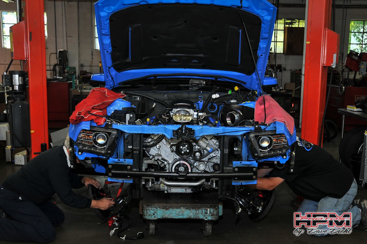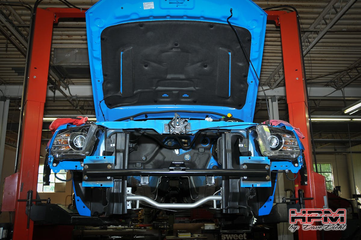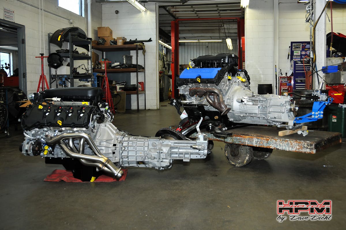 After pulling the stock motor and gearbox out, the new 5.2-liter V8 and the Boss R1 close-ratio gearbox is mated to were installed as one unit from underneath the car.