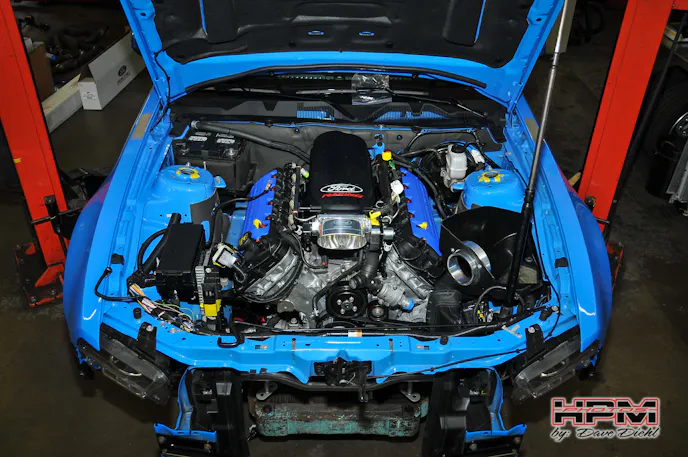Ford Performance also supplied the custom 5.2-liter camshafts that PAE used with this build, which are specially designed for use with a 2013 or 2014 processor, as well as the Cobra Jet intake manifold (PN M-9000-M50CJ). The Cobra Jet manifold’s runners are designed to provide more top-end power without sacrificing low-end grunt, which is ideally paired with Ford’s dual 65mm Cobra Jet throttle body and Cobra Jet cold air intake, both of which are on hand here.