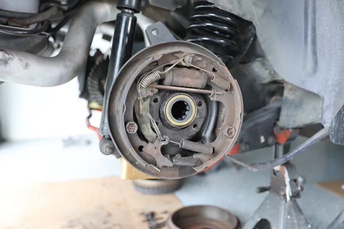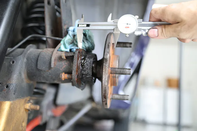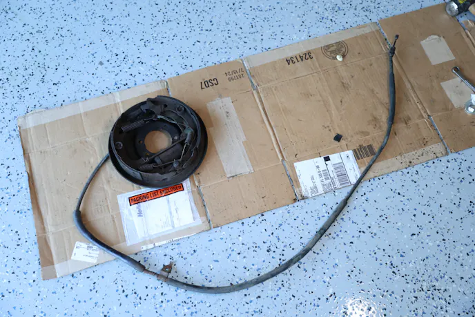 Next up, I tackled the rear brake assemblies. Unbolting the four 3/8-inch backing plate bolts from the axle flanges was easy, followed by disconnecting the brake lines and unhooking the rear parking brake cables. All of this went surprisingly fast, and before I knew it, the entire rear brake setup was out in one clean assembly. One last item then was to double-check the axle flange depth, and make sure I have the required 2.5-inch flange-to-axle-end depth. After a quick confirmation with the dial caliper, I was moving right along!