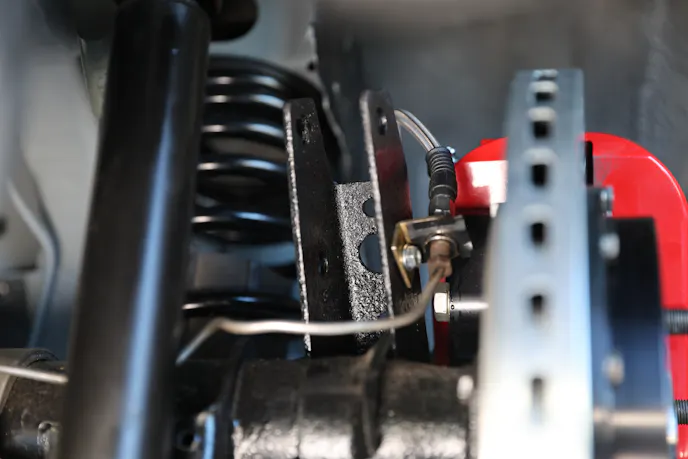 Next up: connecting the brake hoses. Baer provides a solid mounting kit with metal hose clamps and brackets, but I opted to use the factory mounts and bolt them to the stock horizontal shock mounting bracket, which worked perfectly.