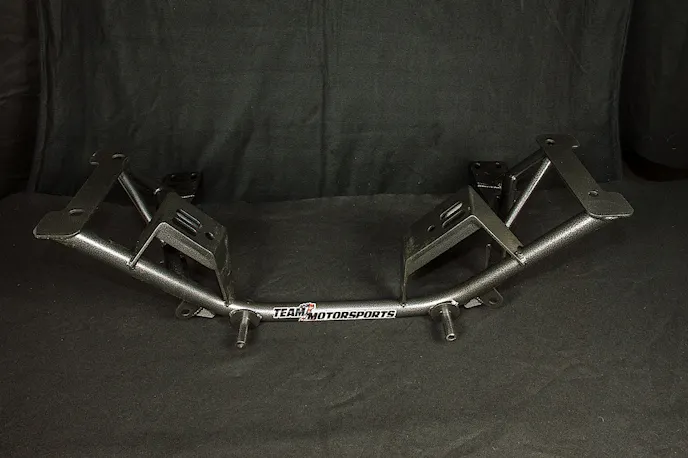 The Team Z K-member is lighter and stronger than the factory original piece. Constructed from 1.50-inch diameter 0.120-inch wall DOM steel tubing, it offers increased front end stiffness and strength. The auto cross kit, part number TZM-AC, which we’re installing on our ’98 GT also adds extra gusseting to the engine mounts and extra thick control arm tabs. The side braces for the K-member are also triangulated. These features give the front suspension additional strength and rigidity.