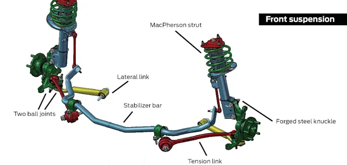 The double ball joint design for the 2015 Mustang’s front suspension is not something new or groundbreaking but it is a major departure from the A-arm suspension we’re accustomed to. A double ball joint front suspension has been in use in European cars from BMW, Audi, VW, and several vehicles from Asian manufacturers, for years.