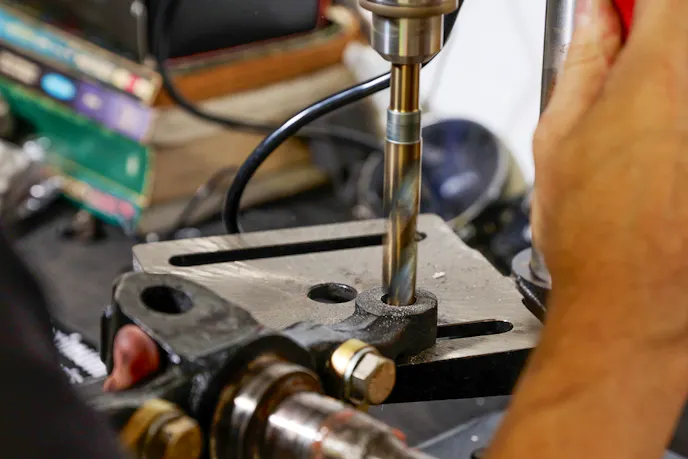 Once the steering rack and rag joint were bolted in and torqued down, the next step was the bumpsteer kit. Its purpose is to align the tie-rod ends parallel to the lower control arms — critical for proper steering geometry with performance suspension components. Though this kit requires drilling the spindles for 5/8-inch bolts to accept the spherical rod ends, do yourself a favor and use a proper drill press or machine shop. I attempted it with a small bench-top press, realized my mistake immediately, and had a local shop knock it out in 15 minutes for $30, which was money well spent!