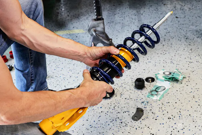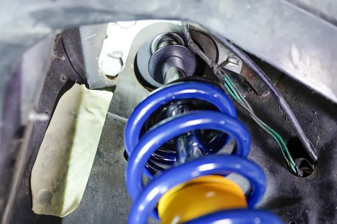 The coilover assembly was surprisingly straightforward: slide the threaded sleeve over the strut, thread on the lower spring perch, add the bump stop, coil spring, and upper spring perch. Ensure that the upper spring perch slides down until it’s flush with the stepped portion of the strut shaft, then simply install the final thrust bearing, washer, seal, and top plate. Before I knew it, the assemblies were ready to go in.