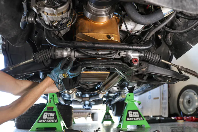 Before lifting the new K-member into place, this is the perfect time to inspect things like the oil pan gasket, steering rag joint, and engine mounts. With everything out of the way, access couldn’t be better — and skipping this step can come back to haunt you later… (Insert foreshadowing here).