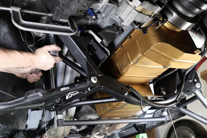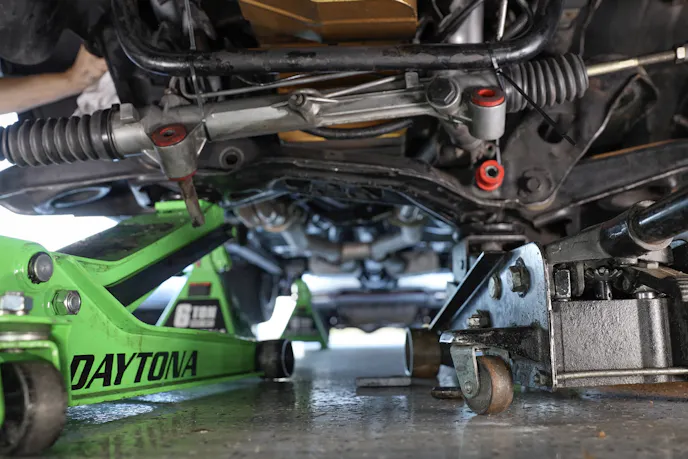 The final pieces were the Eibach sway bar and end links. After greasing and installing the bushings and brackets, just support the bar with two jacks while bolting it to the chassis. That’s the simple part. The sway bar end links are what’s tricky, so here’s a tip: Install both links except for the bottom hardware.
