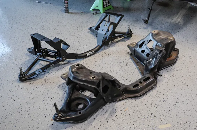 Seeing that massive chunk of stamped steel slide out from under the car was incredibly satisfying. Sitting next to the new tubular Maximum Motorsports K-member, the difference was night and day. The new unit offers more clearance, significantly less weight, and let’s be honest, it just looks fantastic. That absolutely counts.