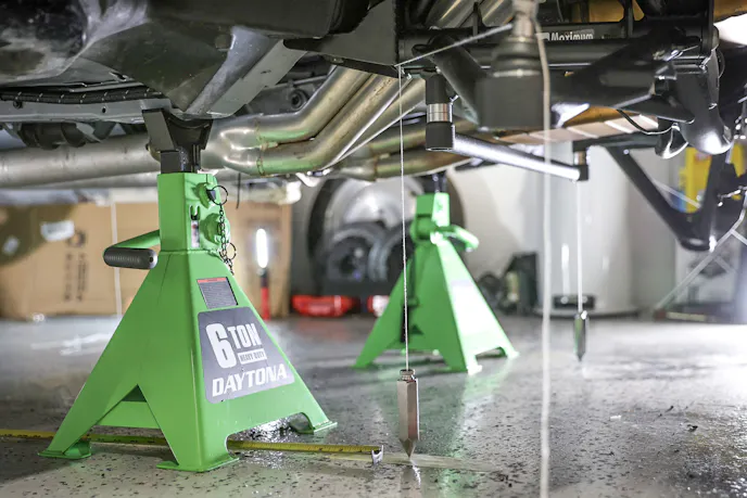 The first step was raising all four corners of the car completely off the ground with it level front-to-back and side-to-side. I recommend using the same style jack stands at each corner, since accurate leveling becomes critical later when aligning the new K-member.