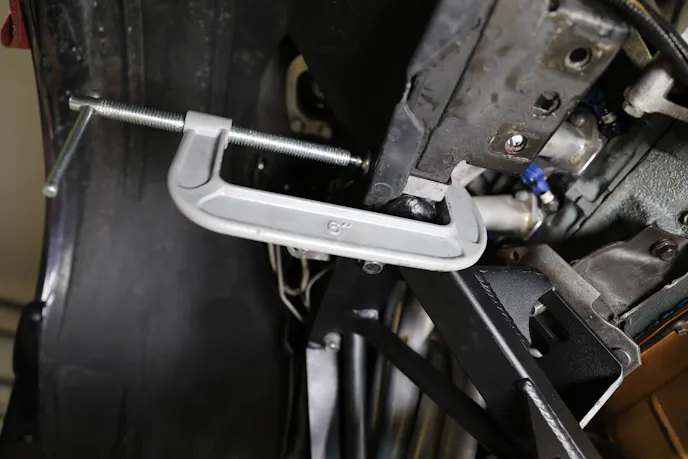 Once front-to-back measurements were within 1/8-inch, I snugged the mounting bolts and C-clamped the provided L-brackets to the frame. These are clamped, touching the front of the K-member prevent forward movement. Then came diagonal measurements from driver side to passenger side, and vice-versa, while making the adjustments on the K-member left or right with gentle persuasion of a mallet until both diagonals matched within an 1/8-inch.