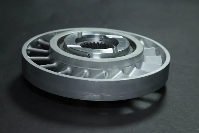 A side view of the NXS torque converter. Notice the two different colors of aluminum alloy top and bottom – these formulations are selected for their individual properties and how they perform in the intense environment a torque converter experiences. We can’t show off too much of the internals (other than the stator below) at Marty’s request. R&D is expensive!