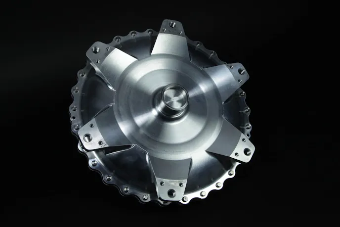 A side view of the NXS torque converter destined for Project Blown Z. Notice the two formulations of alloy top and bottom - these are selected for their individual properties and how they perform in the intense environment a torque converter experiences.