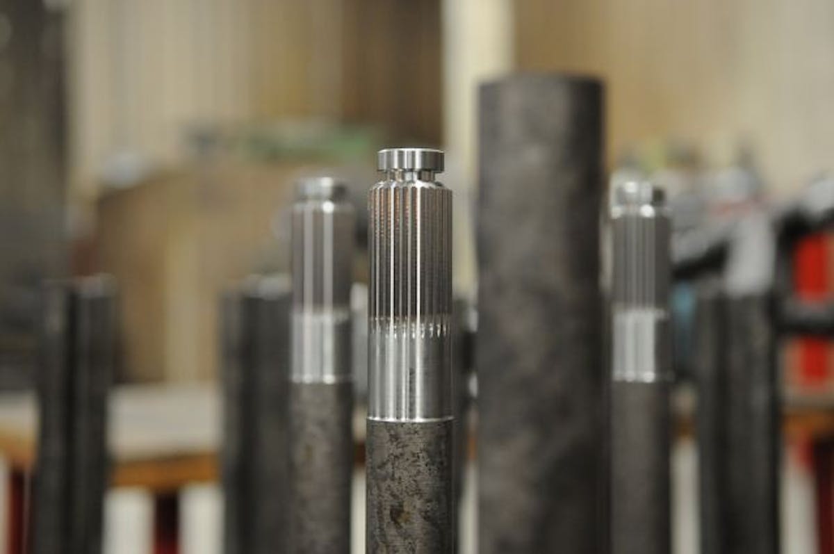 Here, a housing is shown with an alignment bar placed through the center of the can, which is used to help align the tubes as they're welded.