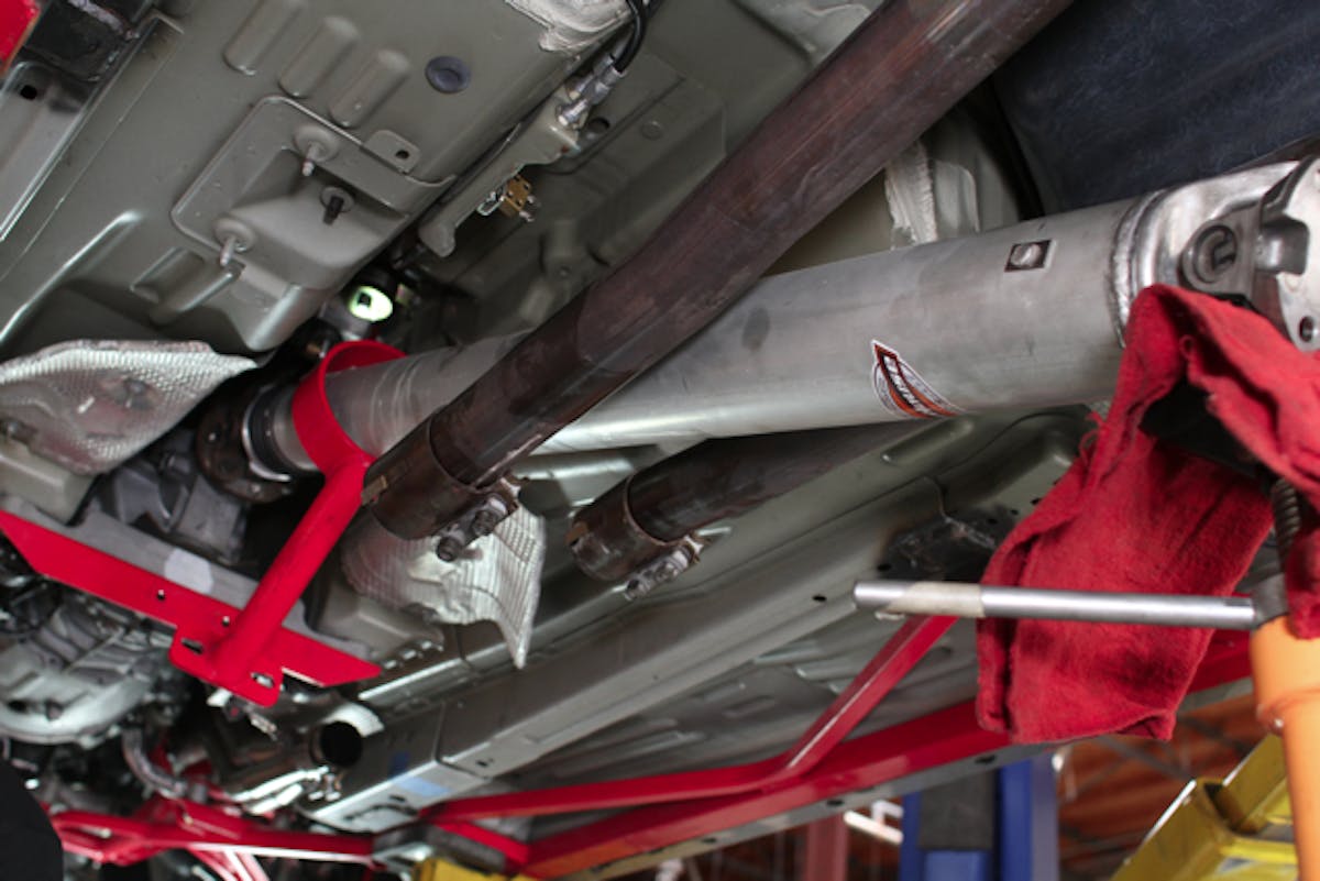With the car up on a hoist, the first business at hand is to get the exhaust system out of the way. Remember to disconnect the oxygen sensor wiring before dropping the exhaust. If you're doing this job at home without a hoist, be sure to take all necessary safety precautions, including jack stands on all four corners of the car. As you can probably tell from Sean's face, the exhaust did provide us with a little bit of removal resistance.