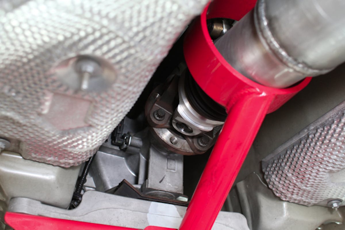 With the car up on a hoist, the first business at hand is to get the exhaust system out of the way. Remember to disconnect the oxygen sensor wiring before dropping the exhaust. If you're doing this job at home without a hoist, be sure to take all necessary safety precautions, including jack stands on all four corners of the car. As you can probably tell from Sean's face, the exhaust did provide us with a little bit of removal resistance.