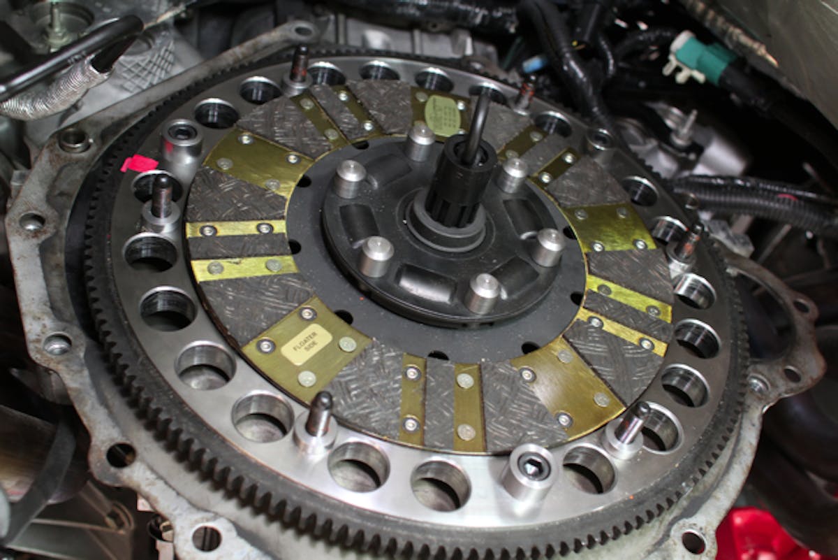 The arrangement of components is only a little more complex, as shown in the diagram. The pressure plate is almost unchanged, except it is deeper to handle the extra clutch disc and floater plate. The two clutch discs are connected by drive pins and the floater plate sits between them. The drive pins allow the clutch discs to turn as one, but lets them move axially to release their grip and to accommodate disc wear. “We wanted to go with a positive drive floater type clutch system because it’s already a proven technology that we see in Top Fuel cars,” mentioned Baty.