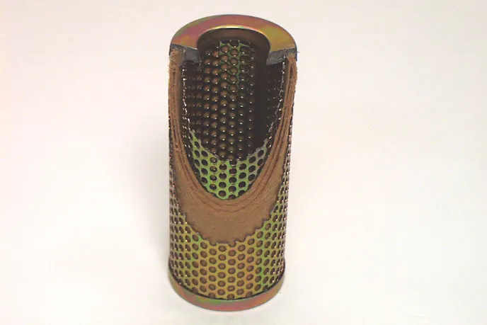 The element itself can be unrolled and inspected for any foreign particles. Instead of pleated construction like a typical off-the-shelf filter, the layers of the element are rolled around the inner cage, then captured by an outer cage to keep it in position; it’s subsequently capped at both ends to retain the media.