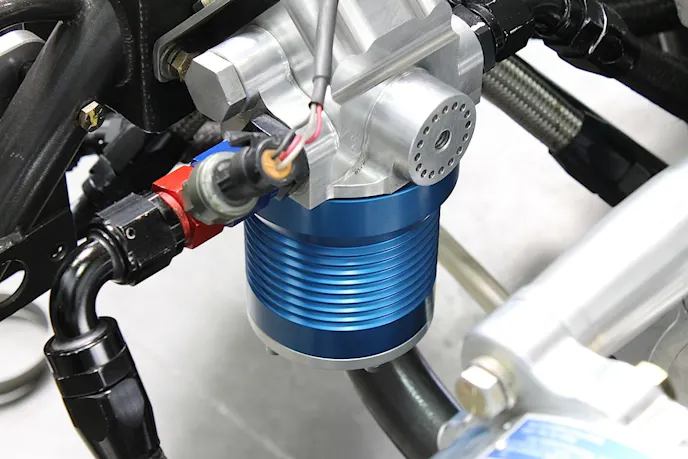 The fiber will filter particles all the way down to eight microns — that’s three ten-thousandths of an inch. The filter body is a billet work of art — it has four simple bolts to aid in removal of the 2 5/8-inch-tall element, which can subsequently be inspected and replaced.