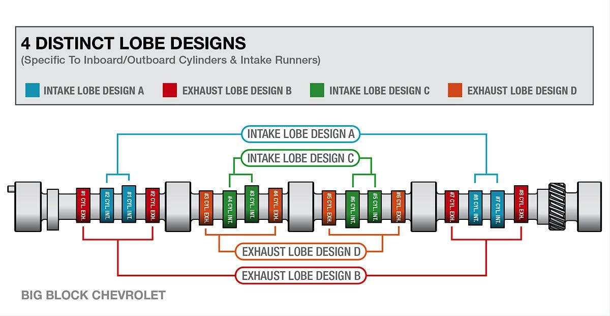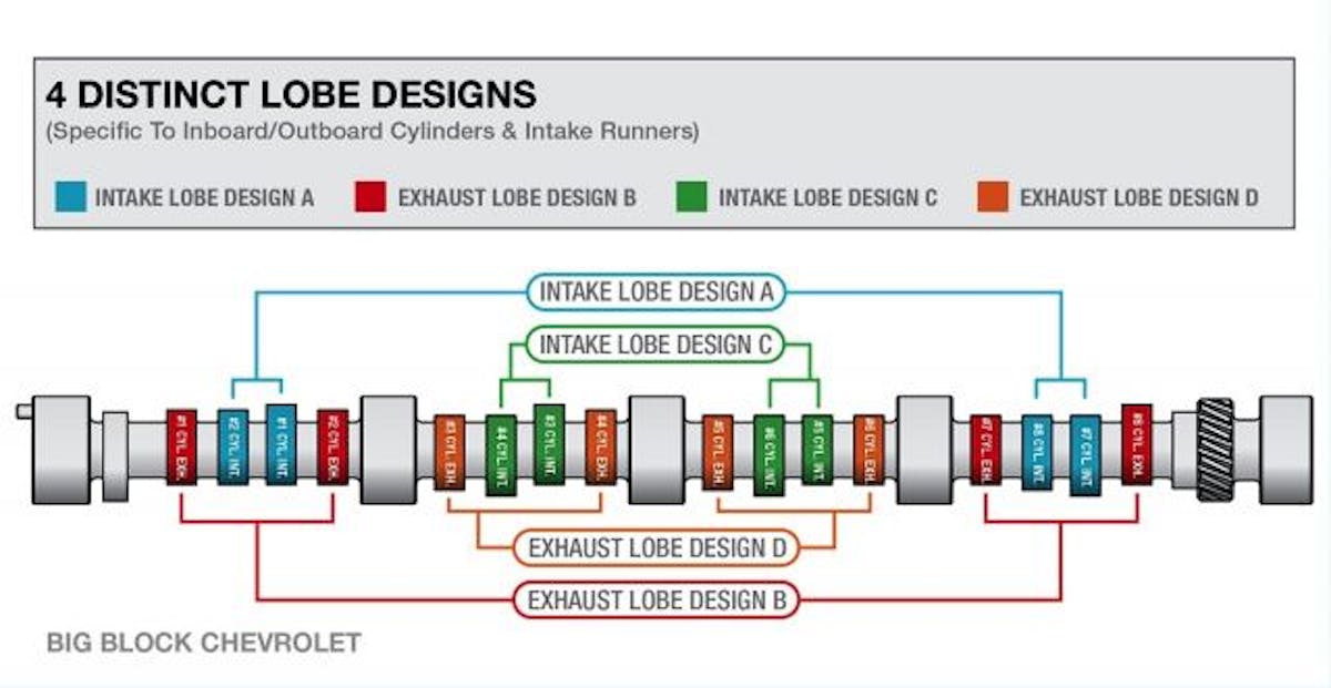 The 4-Pattern cams incorporate four different lobe patterns with specific intake and exhaust timing for outboard and inboard cylinders. The four inboard cylinders utilize the same grind while the outboard intake opening point is delayed two degrees and the exhaust opening comes two degrees earlier. This initiates outboard cylinder blowdown earlier to lower cylinder pressure on the exhaust cycle, thus reducing high-rpm pumping loses and presenting less resistance and potential contamination to the incoming charge.