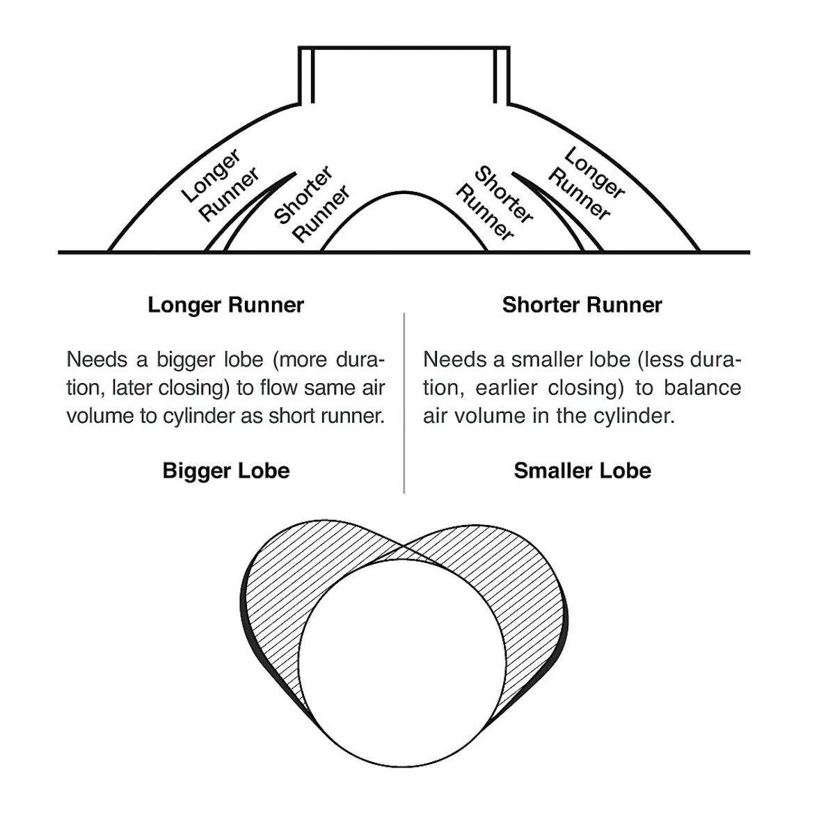 The Comp strategy gives the cylinders with longer runners (outboard 4 corners) more duration (time in degrees) and a later intake closing to move the same air volume as the center (inboard) runners. Shorter runners need less duration and earlier intake closing event to balance the air flow volume between cylinders.