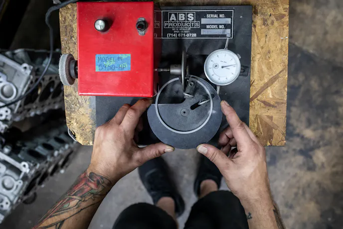 The basics of L&M’s sleeving process are repeatable across other Modular engines like the 5.4 and 5.8, so Hiel adjusted the machinery to set up for our Coyote block. He sleeved several other Coyotes on the same day, so the setup process remained the same across the group after our block was tuned up.
