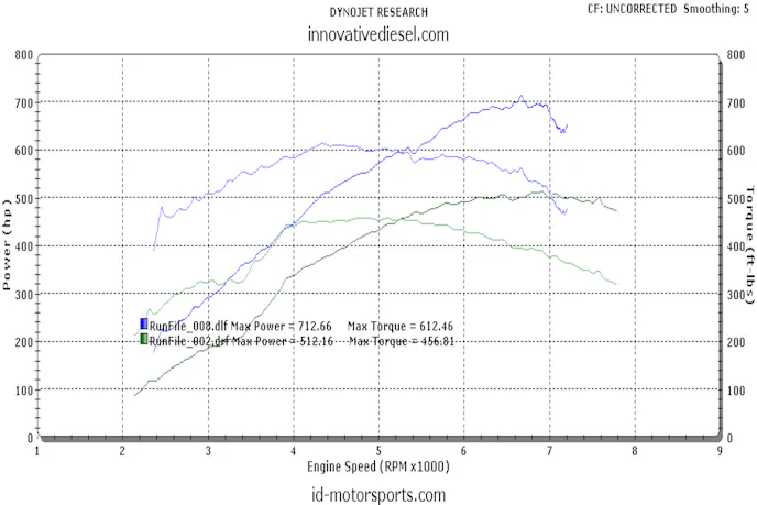With the addition of a Whipple supercharger, 10-rib belt conversion, Kooks headers, DeatschWerks injectors and a custom ID Motorsports calibration the F-150 put down 712 horsepower and 612 lb-ft of torque. Better yet, the gains are from the jump and carry on throughout the powerband.