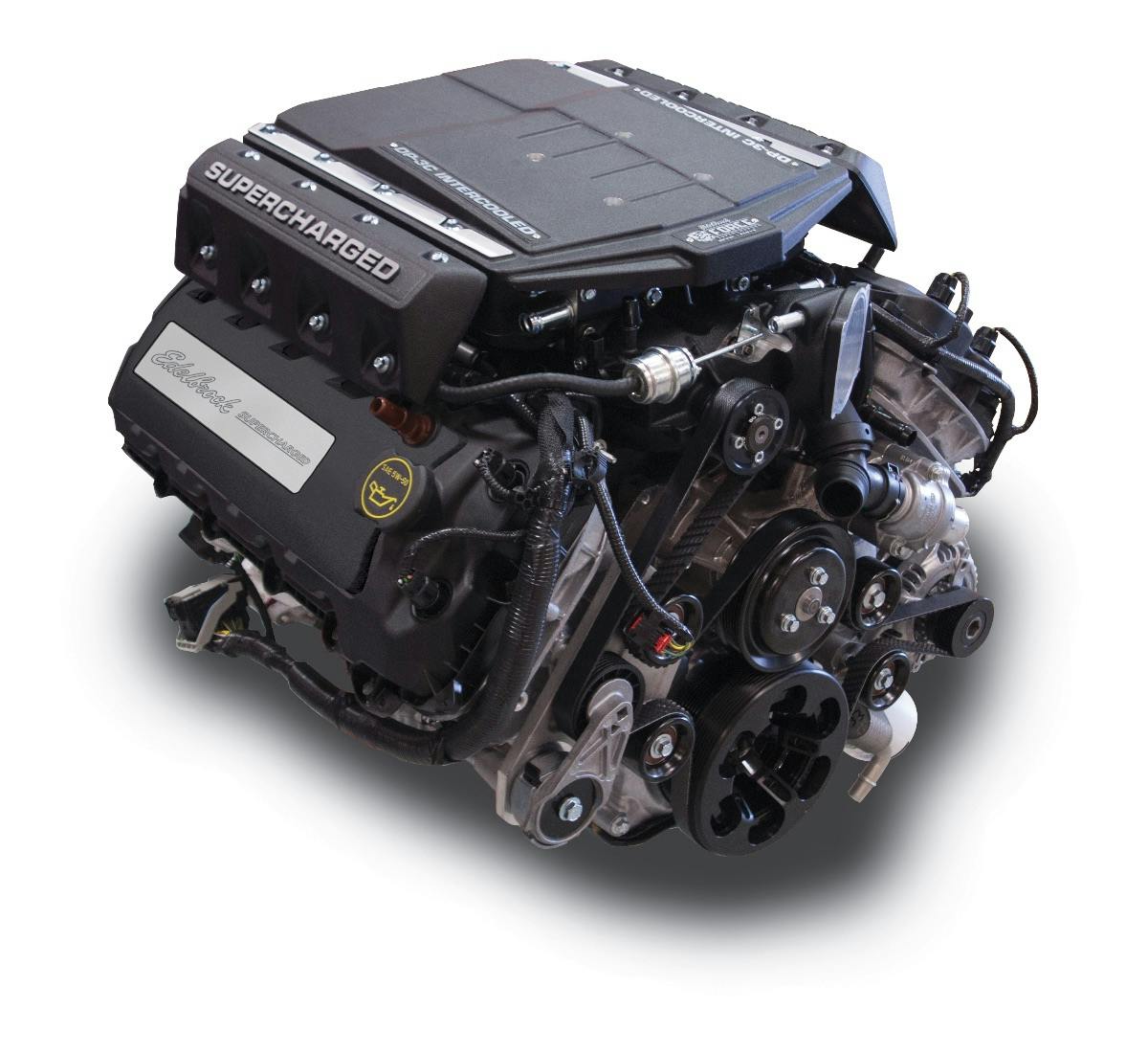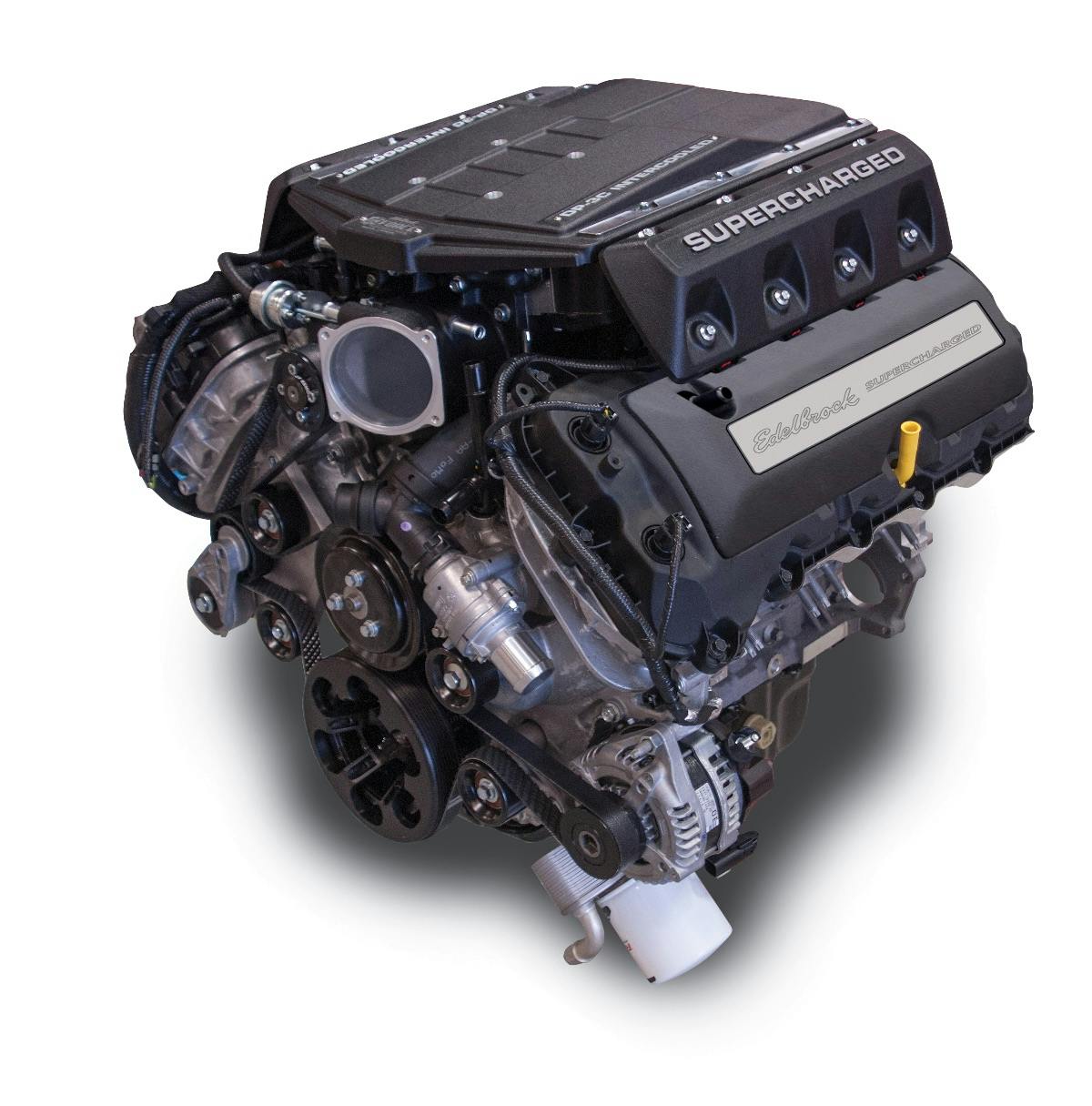 To deliver on that performance promise, Edelbrock builds a 9.5:1 Coyote with Mahle forged pistons and Manley forged rods. The heads are factory Coyote parts, but the aforementioned supercharger sits atop them. This is more than just a built engine with a blower, however. It is a complete package, as it includes a complete front-end accessory drive, as well as an electric intercooler water pump, intercooler recovery tank, fuel rails, 50 lb/hr fuel injectors, coils, mass air flow sensor housing and a re-usable air filter.