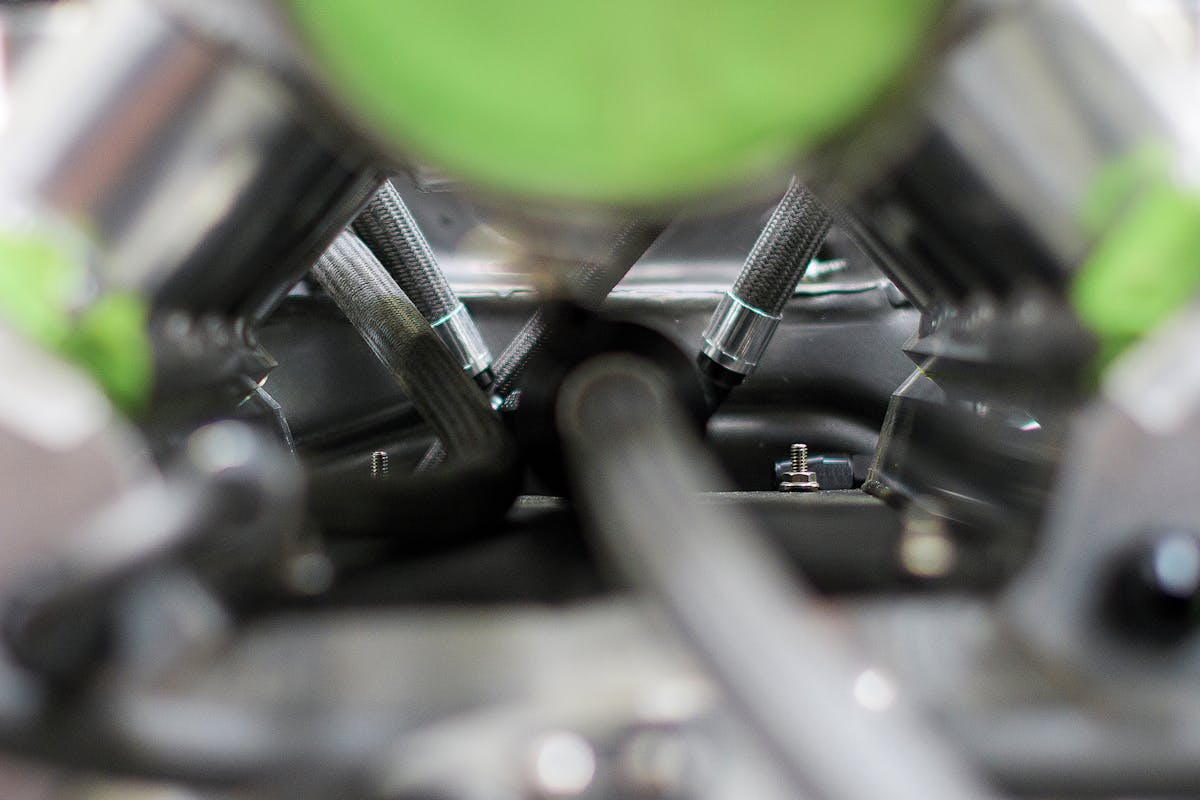 The Auto-crimp hose ends used on the project Mustang are a technology accepted by more and more high-end teams wanting to invest in the most secure AN-fittings possible. It’s no small expenditure to outfit your shop with a hydraulic crimping machine such as the Earl’s D100 Series Crimper.