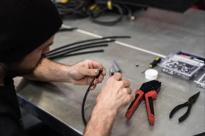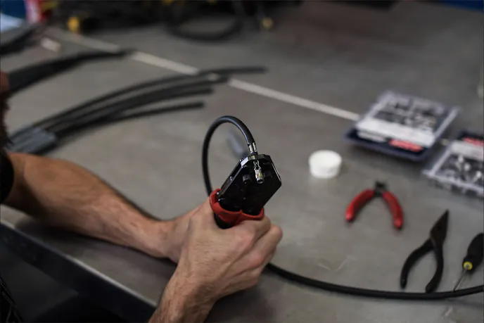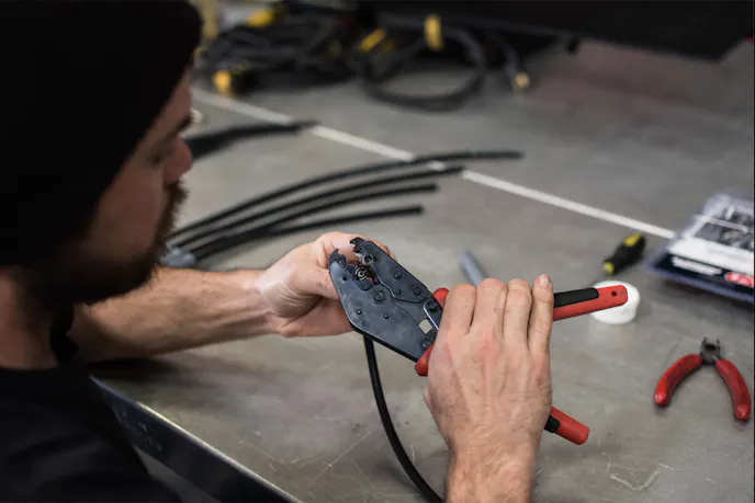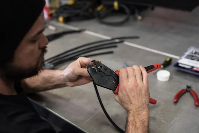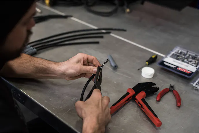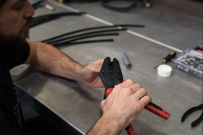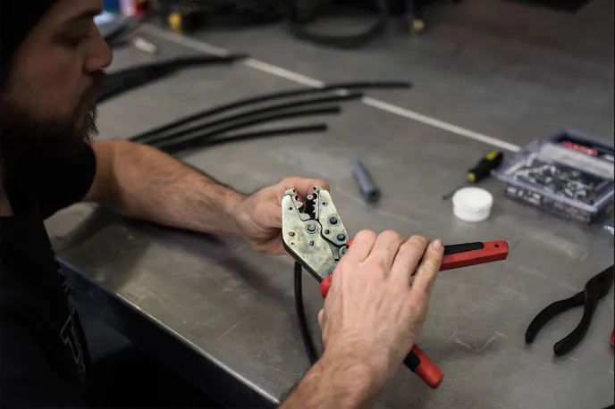 If you have access to one of the crimping tools shown in these pictures, this step is super easy. Place the assembly into the jaws of the crimping tool and squeeze the handles together until they stop moving. Voila! Complete the process by sliding the boot over the terminal.