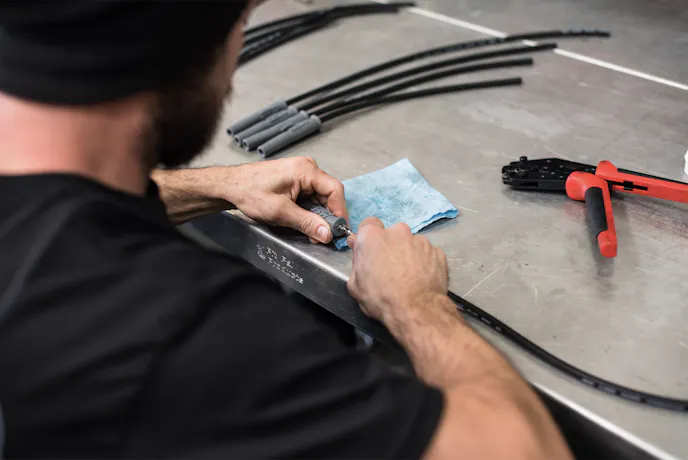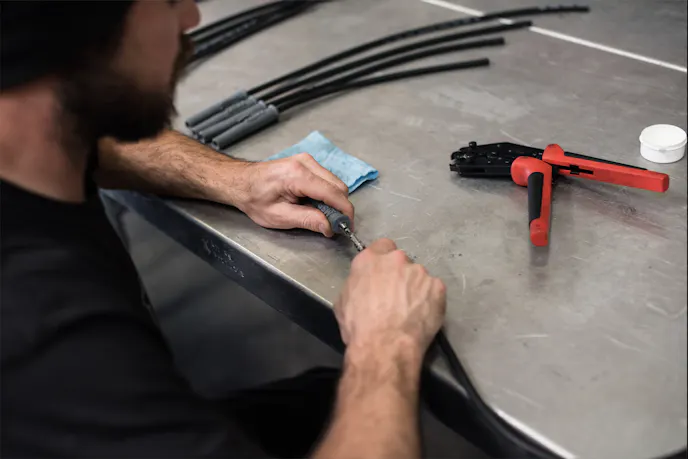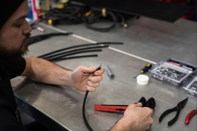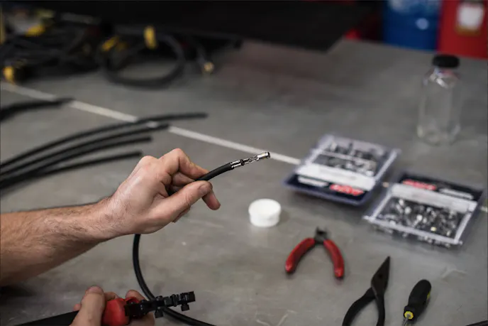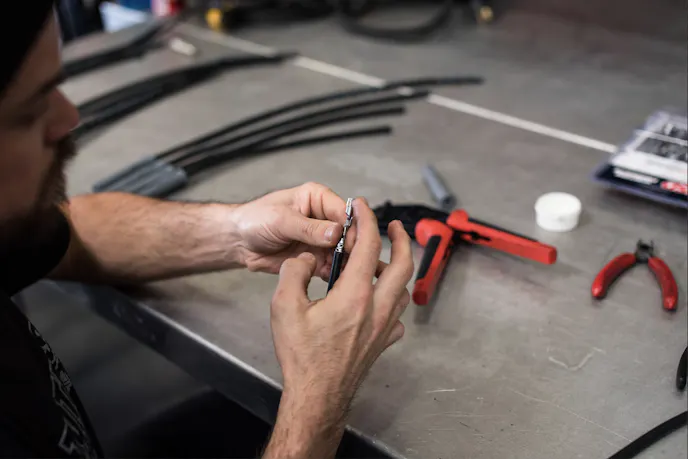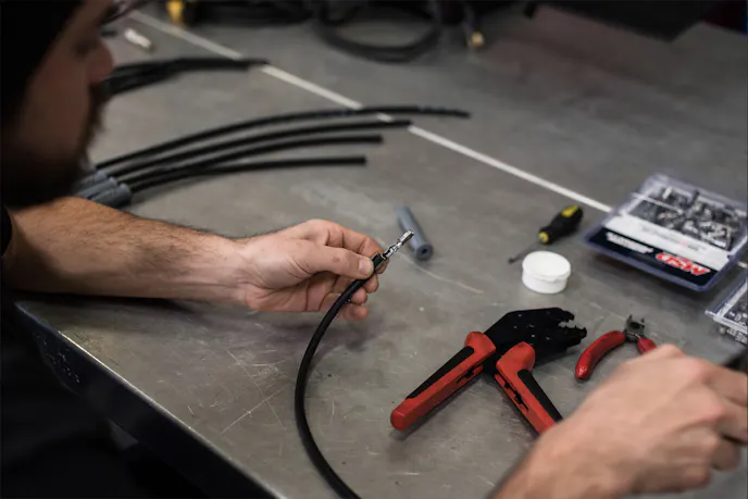 Once placed correctly, a razor blade should be set to the edge of the strip guide, rotating the wire 360 degrees, before twisting the cut end of the plug wire until the silicone sleeve can be pulled off of the wire. When utilizing standard terminals, you’ll need to fold the spiral core back against the wire insulation and slide the terminal over the wire. You’ll want to position the plug wire so that the wire insulation protrudes about 2mm past the crimp tabs. Then, assemble the crimper over the terminal end and position the tool in a vice.