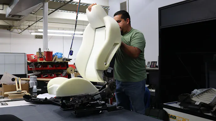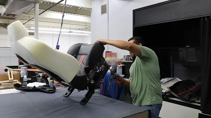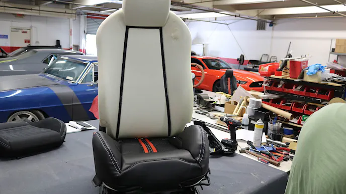 Once we found a swatch that matched the Competition Orange exterior of the Mustang, the team ordered the upholstery to be built, and we waited for Larry to give us a call once the pattern came in.