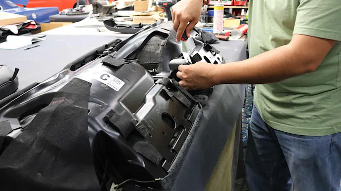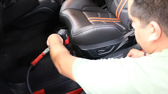When we arrived at the TMI headquarters in Corona, CA on the install date, the team went right to work pulling the stock seats out of the Mustang and installing the new custom interior. The S550 kit comes with direct replacement foam inserts and new custom exterior leather or vinyl of your choice for the front seats. The rear seat upholstery uses the stock rear foam.