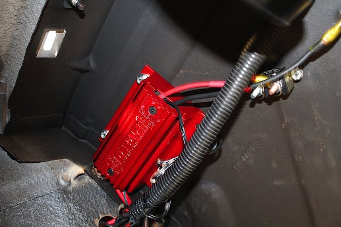 It’s recommended to keep the module itself away from high heat areas near the engine. We chose to install the controller about the only place we had room for it on our 1965 Mustang, Project Biting The Bullitt. With a supercharger, a pair of fluid coolers, and miles of hoses, wires, and tubing, you can imagine that the engine compartment was cramped, to say the least. But up inside the front fenderwell was a great little spot for it, out of the way and easy to get to.