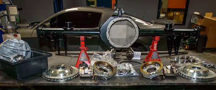 Baer also built the brake backing plates to work with our M9 housing, while at the same time allowing us to retain our ABS and parking brake functionality. The backing plates will actually act as our bearing retainers as well, just as on a standard nine inch housing. Our new SS4 brake kit included everything we needed to install it including calipers, pads, rotors, hoses, parking brake assembly, and the brake backing plates.
