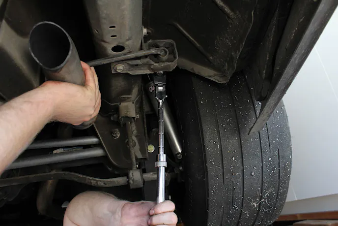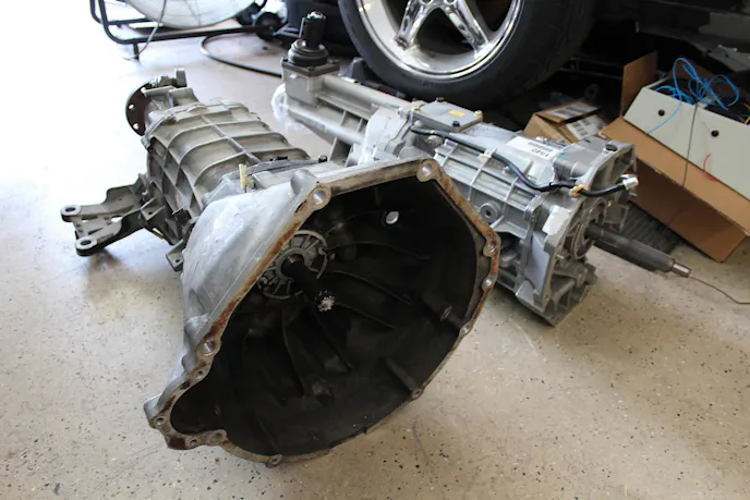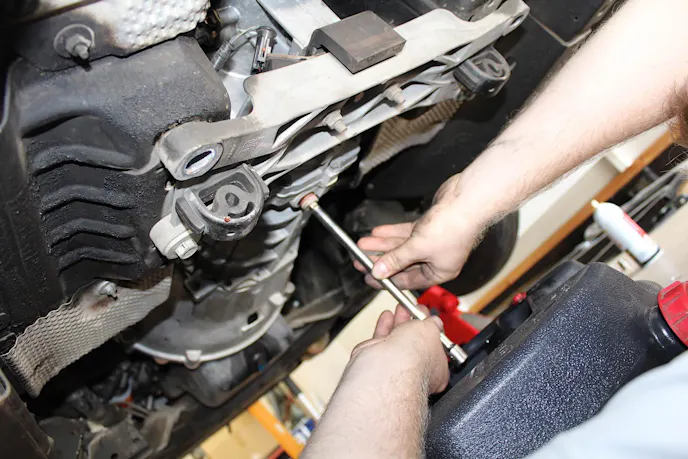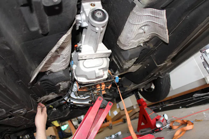 From here, you’ll want to remove the factory starter (that top third bolt is always a pain, so make sure you get clever with your extensions) then support the transmission with a jack stand or a transmission jack and begin removing the factory crossmember. Verify you’ve unplugged all of the factory sensors before you begin unbolting the transmission for removal – the last thing you want is to rip them out while you’re dropping a 150-plus-pound transmission.