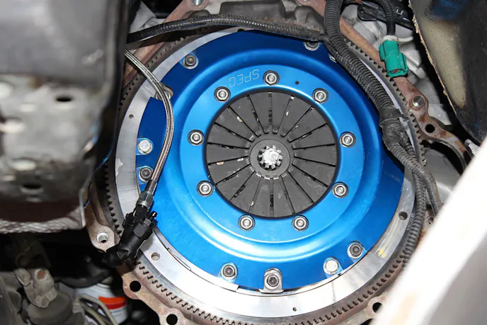 Once the factory transmission is out of the way, we needed to remove our SPEC clutch assembly and replace the current disc-pack (which is meant for a 10-spline transmission) with the new 26-spline discs that SPEC sent us out. As noted in our article installing our clutch the first time, this is why we chose a modular twin-disc setup – you can replace just the discs without the need to buy a new flywheel and pressure plate assembly.