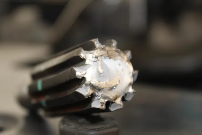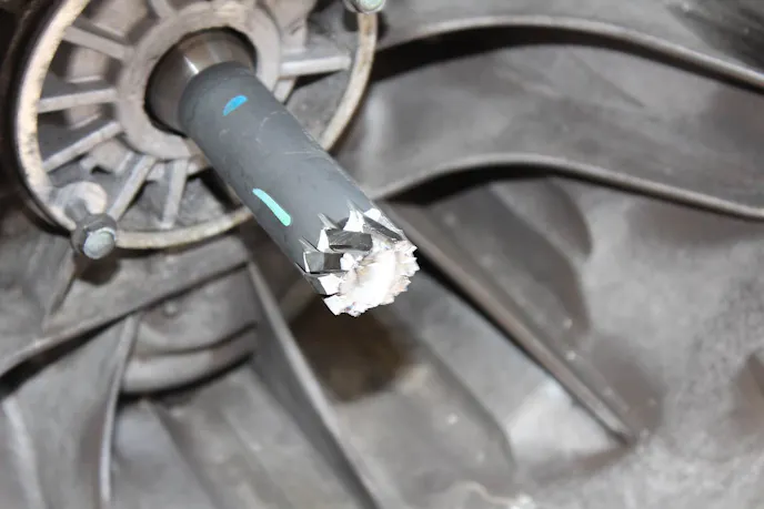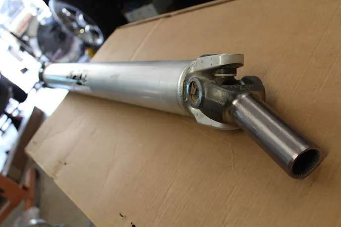 After we removed the factory transmission, we assessed the damage and concluded that we probably only damaged the input shaft itself. We suspect the cluster gear was saved, since it had looked like the input shaft took most of the brutality, but we weren’t about to tear open the vulnerable five-speed to find out. With that, we pressed on and assessed the rest of the drivetrain assembly. The photos below show a severed input shaft placed perfectly in our clutch.