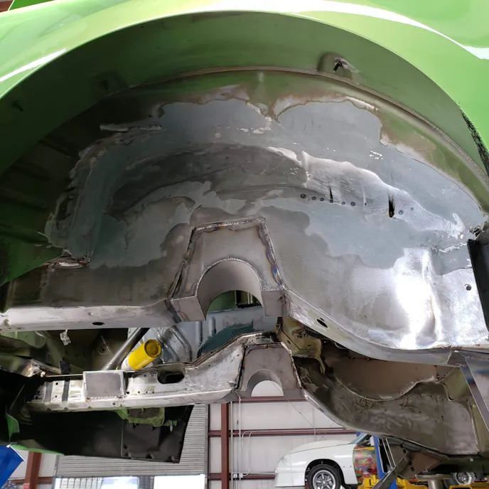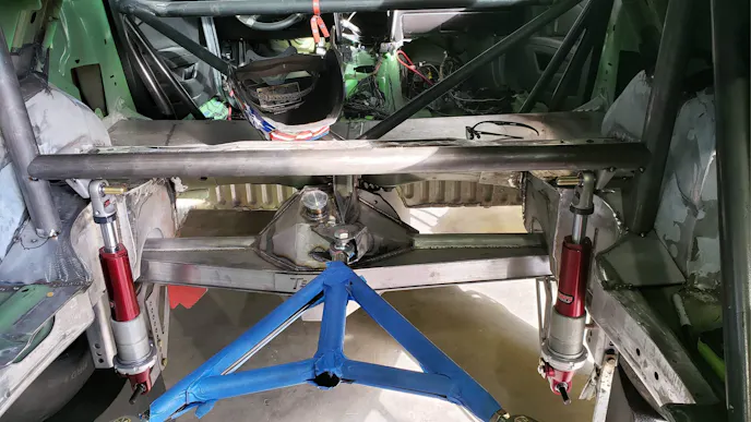 The main reason to move the coilovers to their current position is that running on a radial tire means that the suspension needs to extend to do its job correctly on the track; at their set position, the rear shocks have one inch of compression and seven inches of extension. This location helps them do their job correctly, but requires the factory frame to be modified, as seen in the photos.