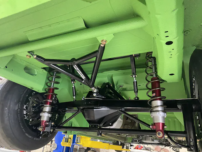 Team Z Motorsports delivered the fabricated housing without the lower control arm mounting points; Lamana designed his own lower control arm mounting brackets to work with this specific vehicle for a couple of reasons. The upper control arm body-side bracket is from Racecraft, Inc. and offers several mounting positions, similar to the housing-side mount. Both uppers and lowers are constructed from chromoly tubing and high-quality Heim joints.