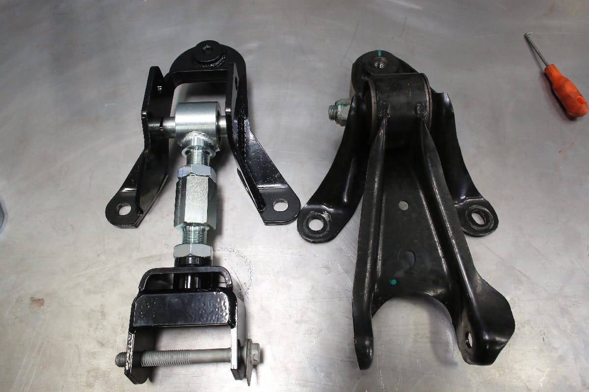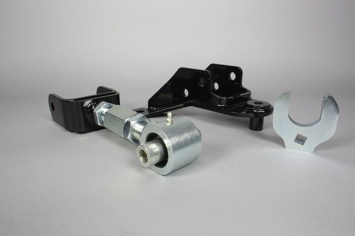 The housing side mount is formed from thick 1/8-inch plate and has a welded, threaded component for the tube adjuster to thread into. The rod end then threads into the adjuster sleeve to provide the double-adjustable mechanism, which allows for changes to be made without removing the arm from the car.