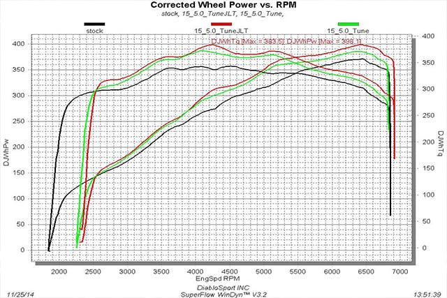 We set up our small handheld tuner, the inTune with a JLT CAI 93 Octane tune. The tune is designed to work specifically with 93 octane and the JLT Cold Air intake on the 2015 Ford Mustang GT 5.0.Uploaded with the DiabloSport InTune tuning device via dyno tune testing, horsepower increase is reported to be in the neighborhood of 28 hp with torque increasing 50 lb-ft, at the rear tires, over the factory numbers. Soon to be available this specially designed street tune will be offered with the purchase of either the inTune or Trinity tuning device. In addition, included with the tuner will be tunes specifically for use of higher octane 93/91 fuel running without a cold air intake. DiabloSport estimates owners will pick up around 15 horsepower and 30 lb-ft of torque over stock with this specific tune.