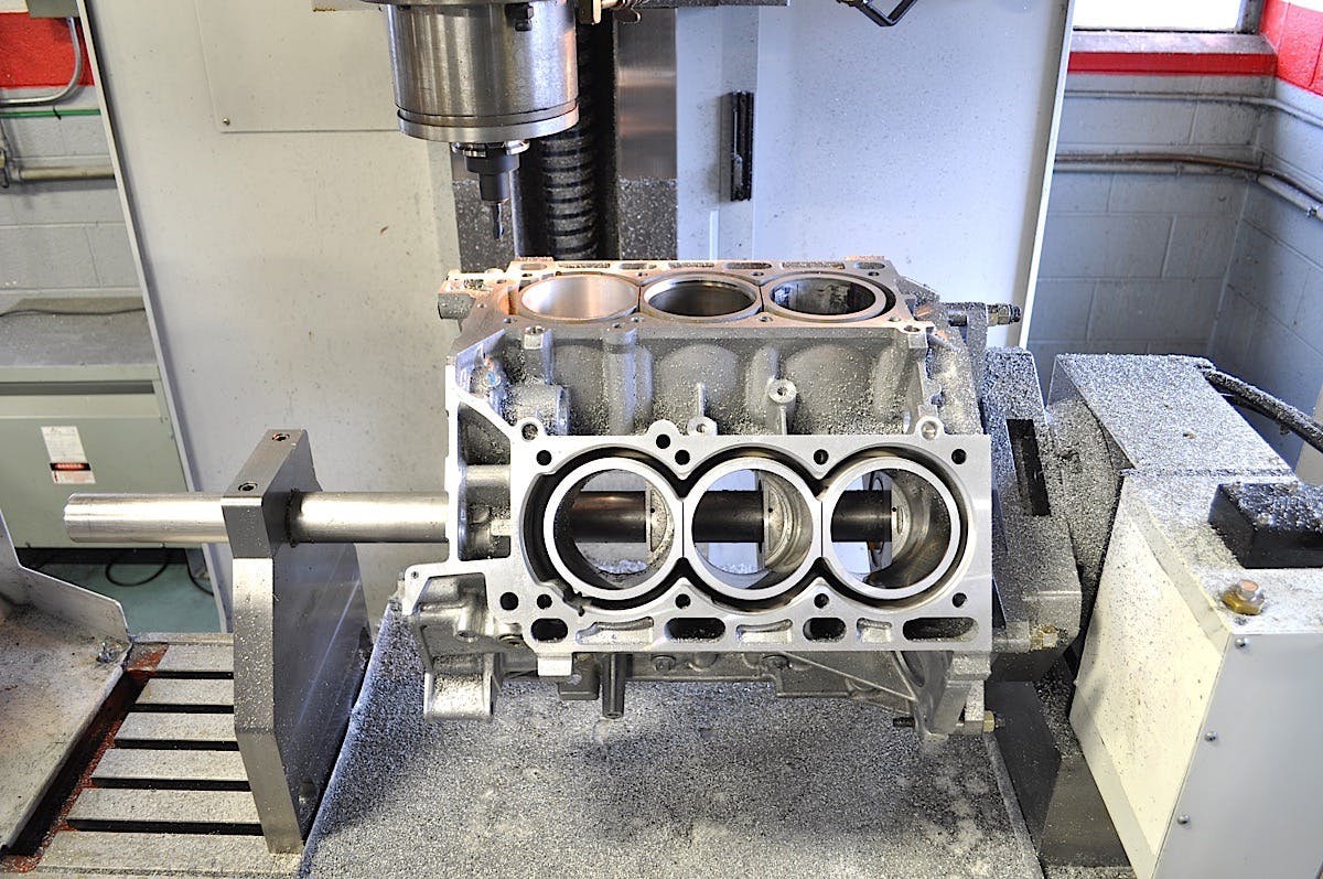 The EcoBoost block is an open-deck design. Livernois machines the deck to accept a billet plate to stiffen the block. Coolant passages are then machined and drilled into the insert.