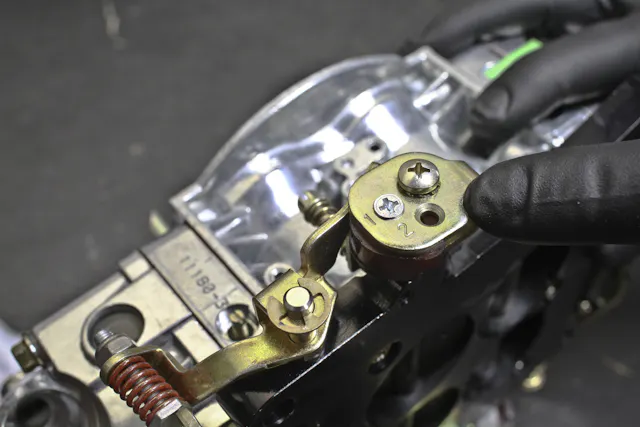 Accelerator Pump – Anytime the throttle is opened rapidly, manifold vacuum drops and the car momentarily runs lean. Pumping an extra shot of fuel in prevents this lean condition, and instead creates a torque-producing slight rich condition. The air/fuel ratio should richen up for a second or two, and then quickly fade back to your desired ratio without ever going lean. Shoot for a light acceleration air/fuel ratio of 13.8:1 (lambda .94). Full throttle acceleration should produce and maintain your total WOT enrichment ratio (12.5:1 or lambda .85 on a naturally aspirated engine). Change accelerator pump squirter size, pump cam, and pump cam position to tune this circuit.