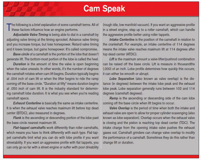 Any camshaft manufacturer’s catalog lists dozens of camshaft types for the same type of engine. This chapter helps you sort through what each of the terms mean and how they affect your engine’s performance and durability.
