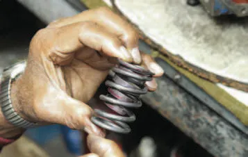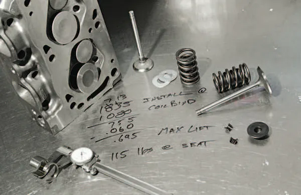 The best time to check for coil bind is when you’re degreeing the camshaft. Do this before permanently bolting on the heads. Most cam grinders tell you the recommended installed spring height and seat pressure. Correct installed height and spring pressure are achieved with the use of shims as necessary. Coil bind is checked by measuring coil spacing with the valve at maximum lift. There should be no less than .060 inch between the coils at full valve lift. Retainer to valve guide clearance at full lift is the same; no less than .060 inch. This clearance is vital because coil bind or retainer contact with the head causes valve-train failure. The .060 inch you give it allows for thermal expansion of metal parts and any camshaft aggressiveness and spring movement at high revs.